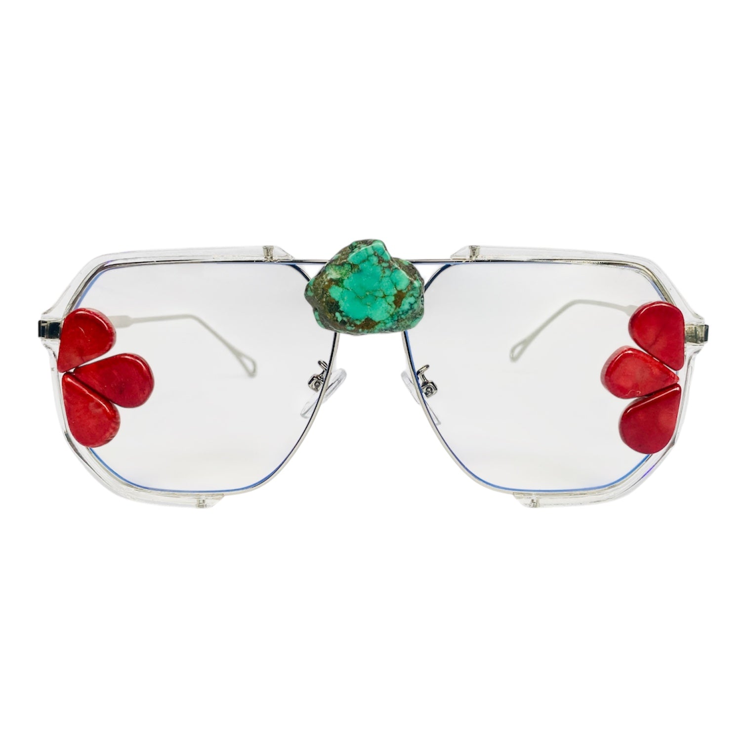 Contemporary oversized aviator frames with raw and cultured natural gemstones featuring raw turquoise at the bridge as the focal point symbolizing protection and wisdom, and flanking the temples clusters of rich toned coral teardrop shaped stones forming flower formations evoking the vibrant life and protective spirit of the sea