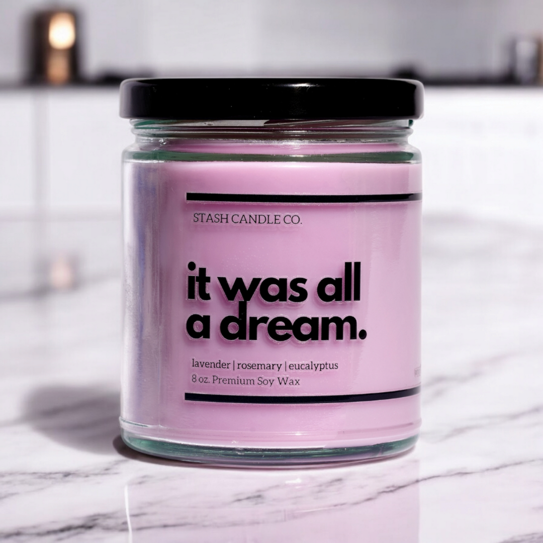 Indulge in the dreamy scent of our It Was All a Dream candle. Experience the enchanting blend of fresh lavender, aromatic rosemary, and invigorating eucalyptus. Let your senses be transported to endless fields of blooming flowers with every burn. A truly luxurious and exclusive addition to your home.