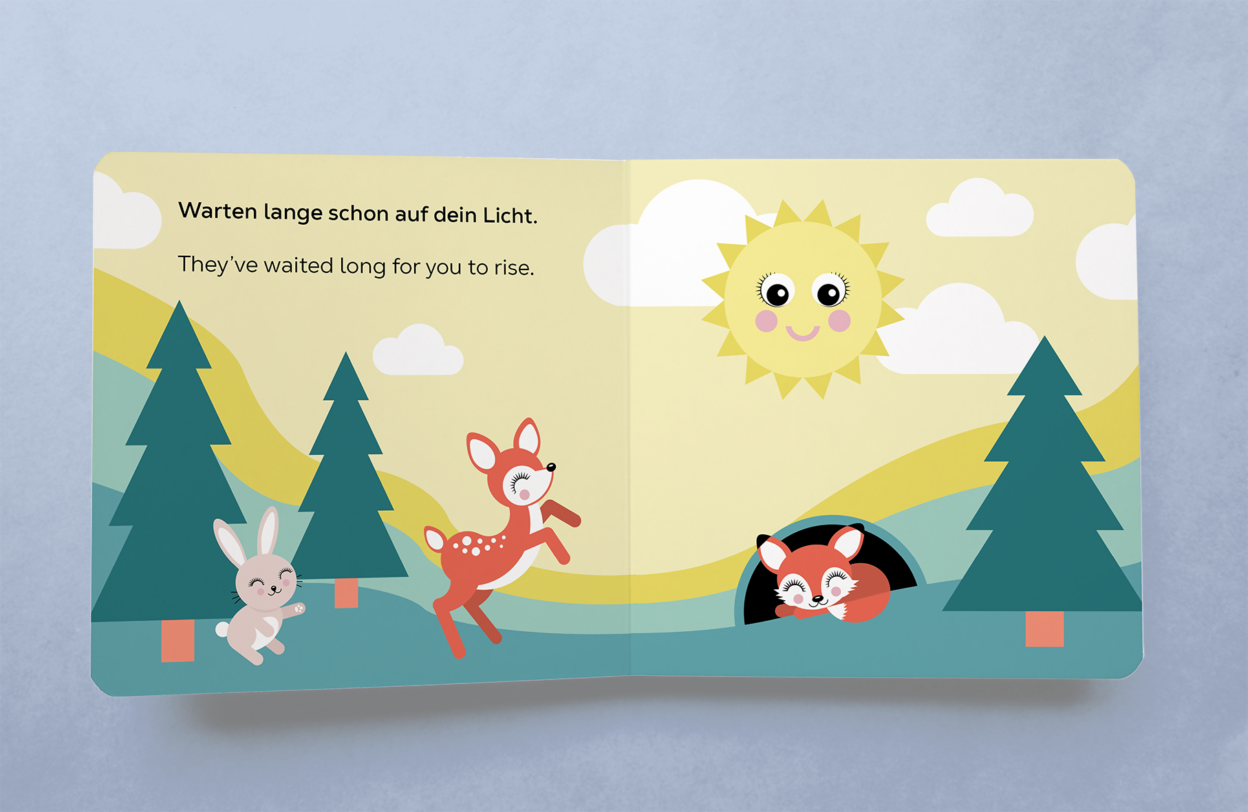 With simple, rhythmic rhymes in German and English, it follows the daily journey of the sun. Everyday moments are captured in lovingly hand-crafted illustrations, while children playfully learn colors, counting, and the bilingual naming of objects and animals.