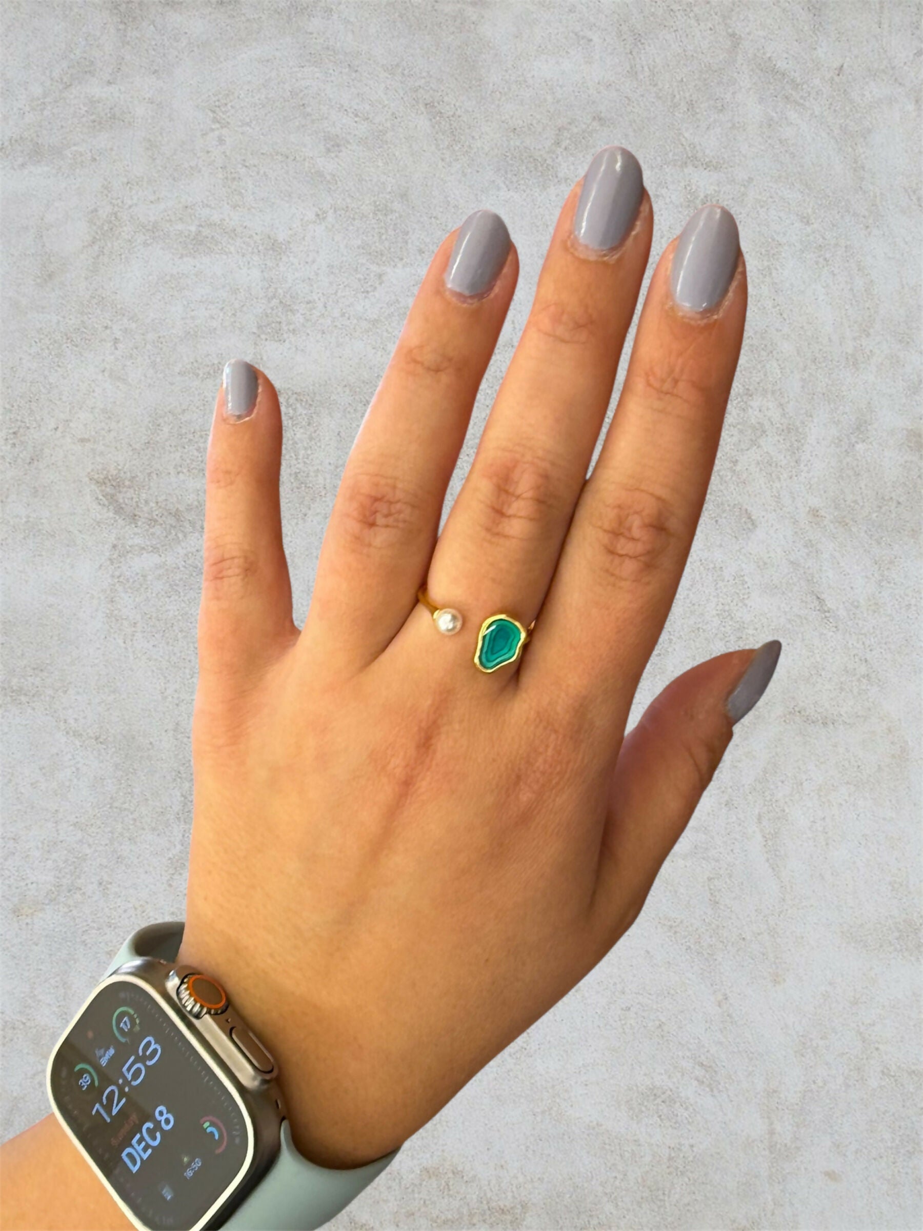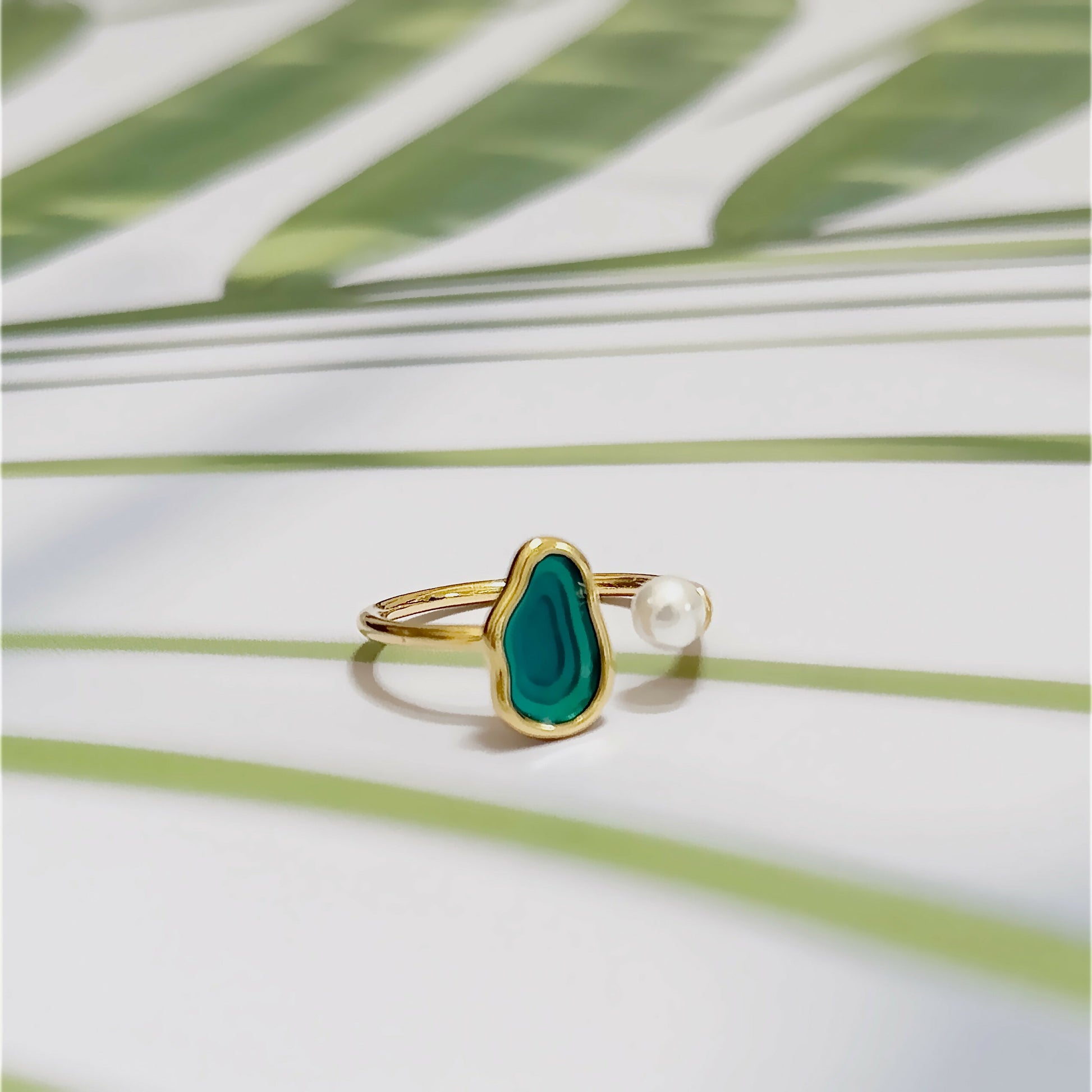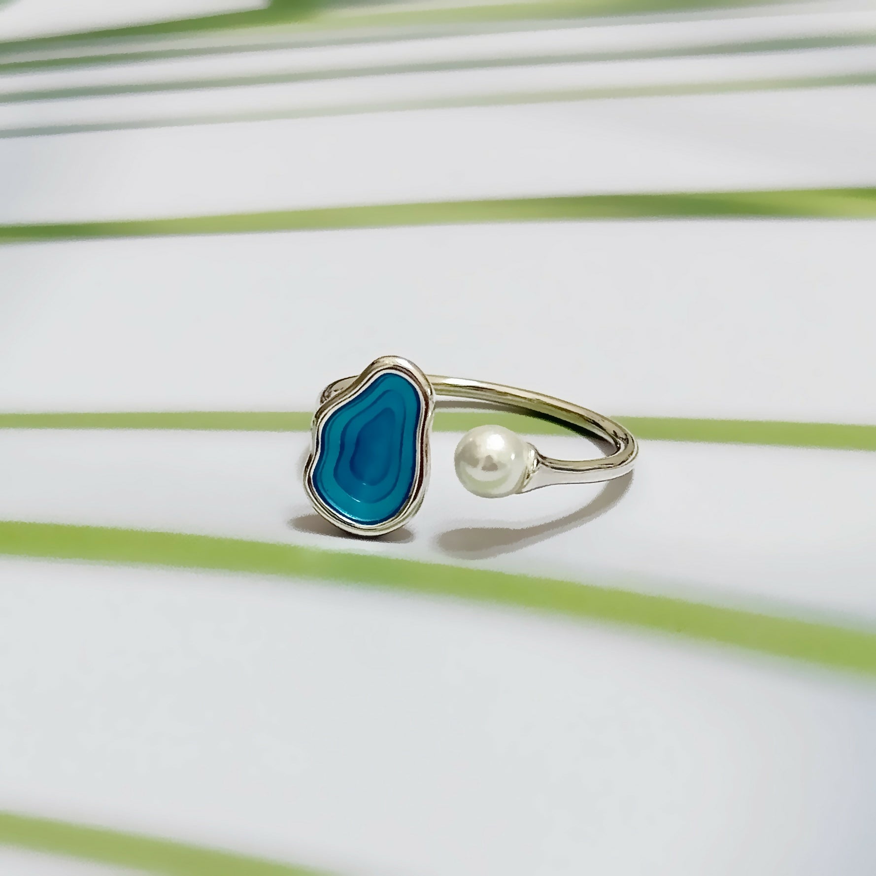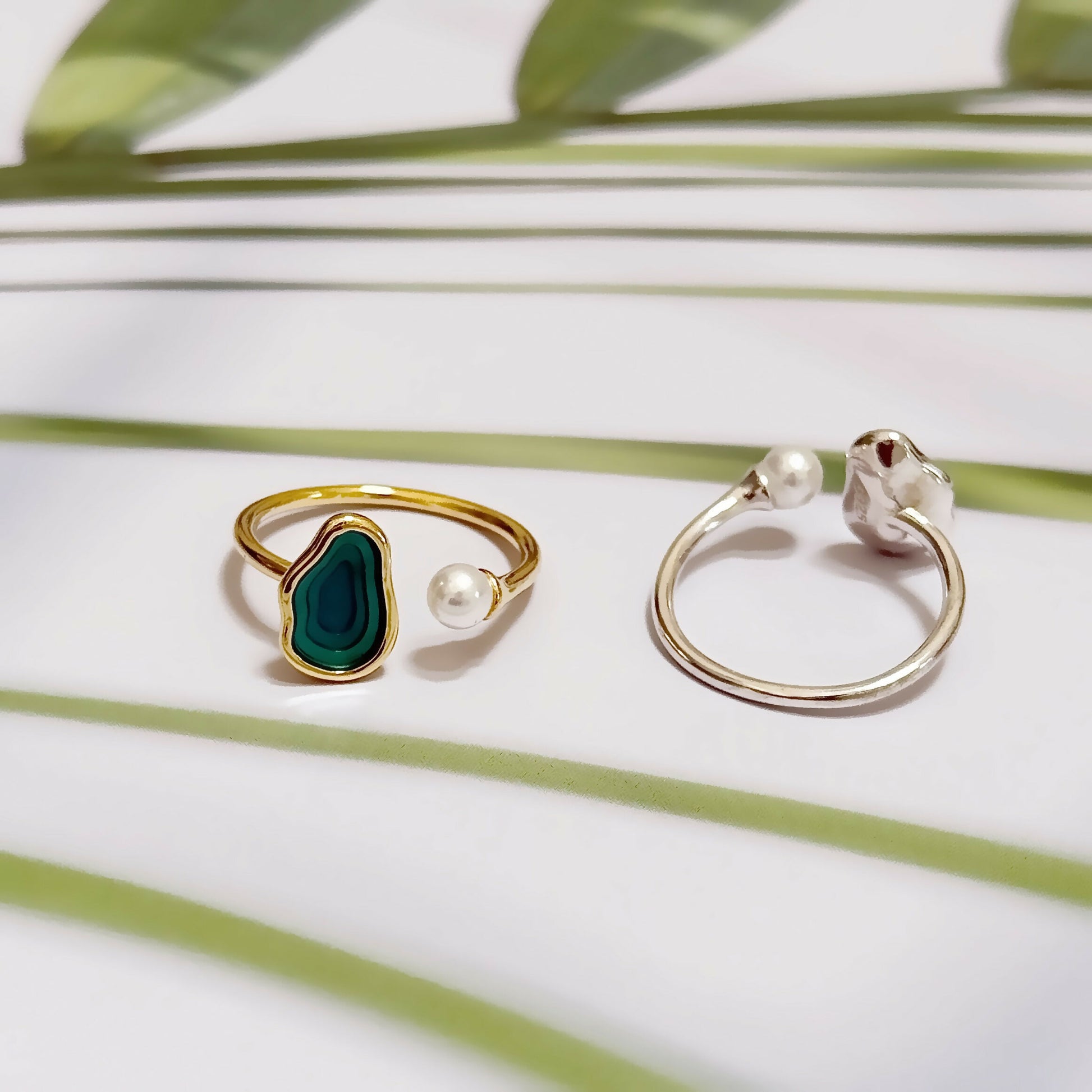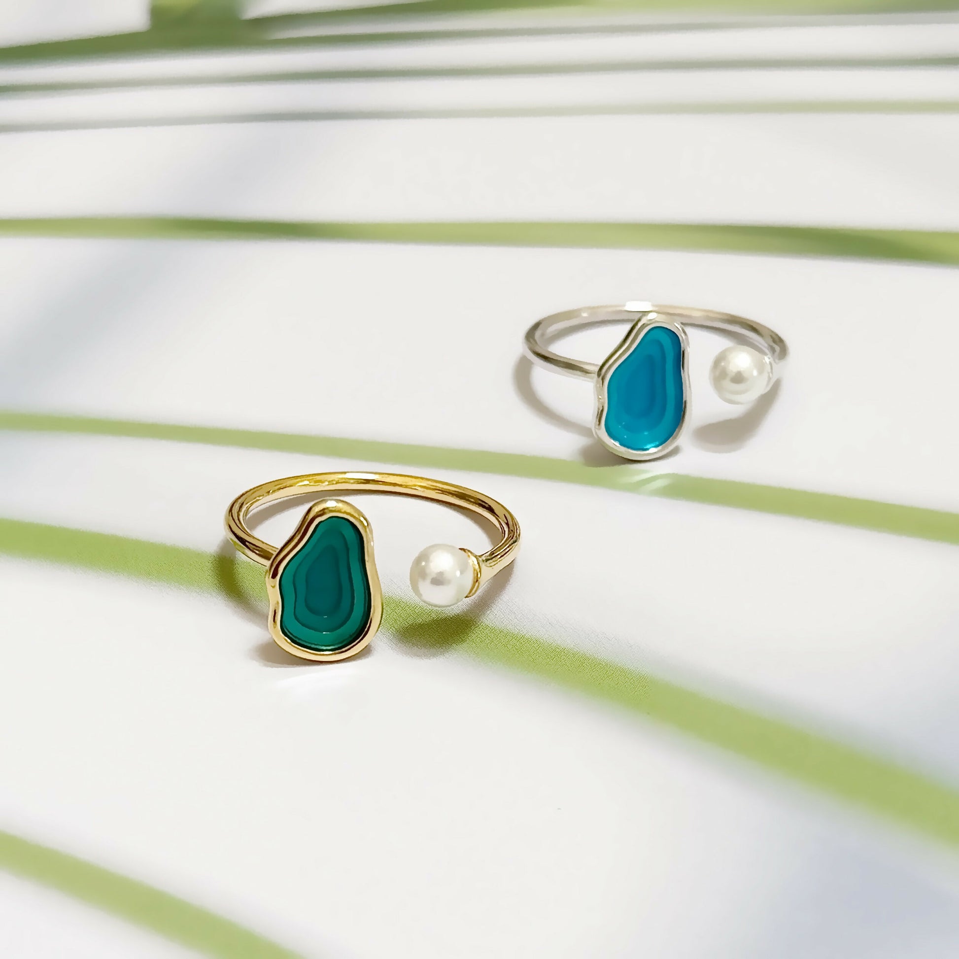 Inspired by lakes, these rings feature shell pearls and colored resin. Crafted from 92.5 sterling silver and plated with 18K gold, they capture the beauty of serene waters. Available in blue and green, these unique pieces blend nature's elegance with exquisite craftsmanship.