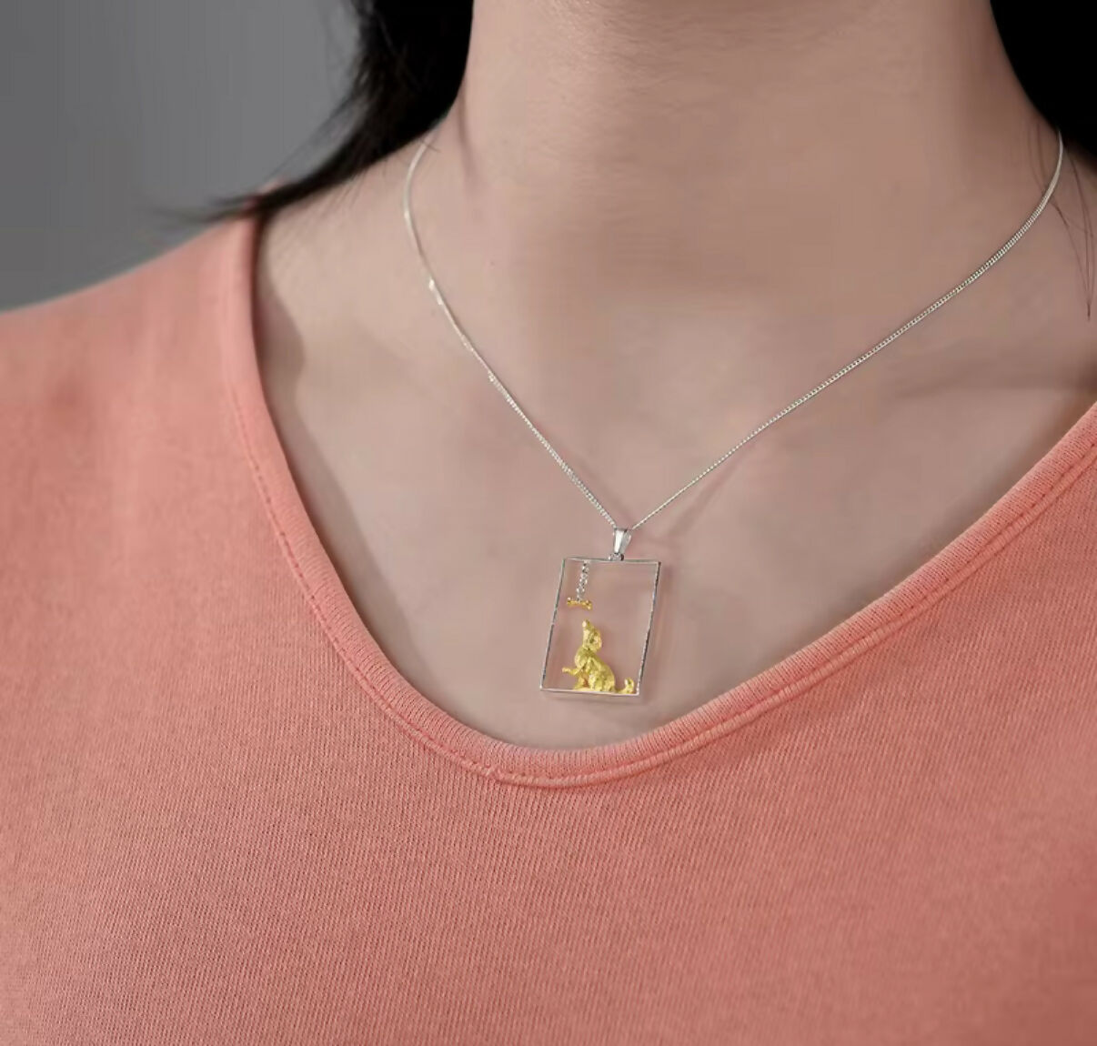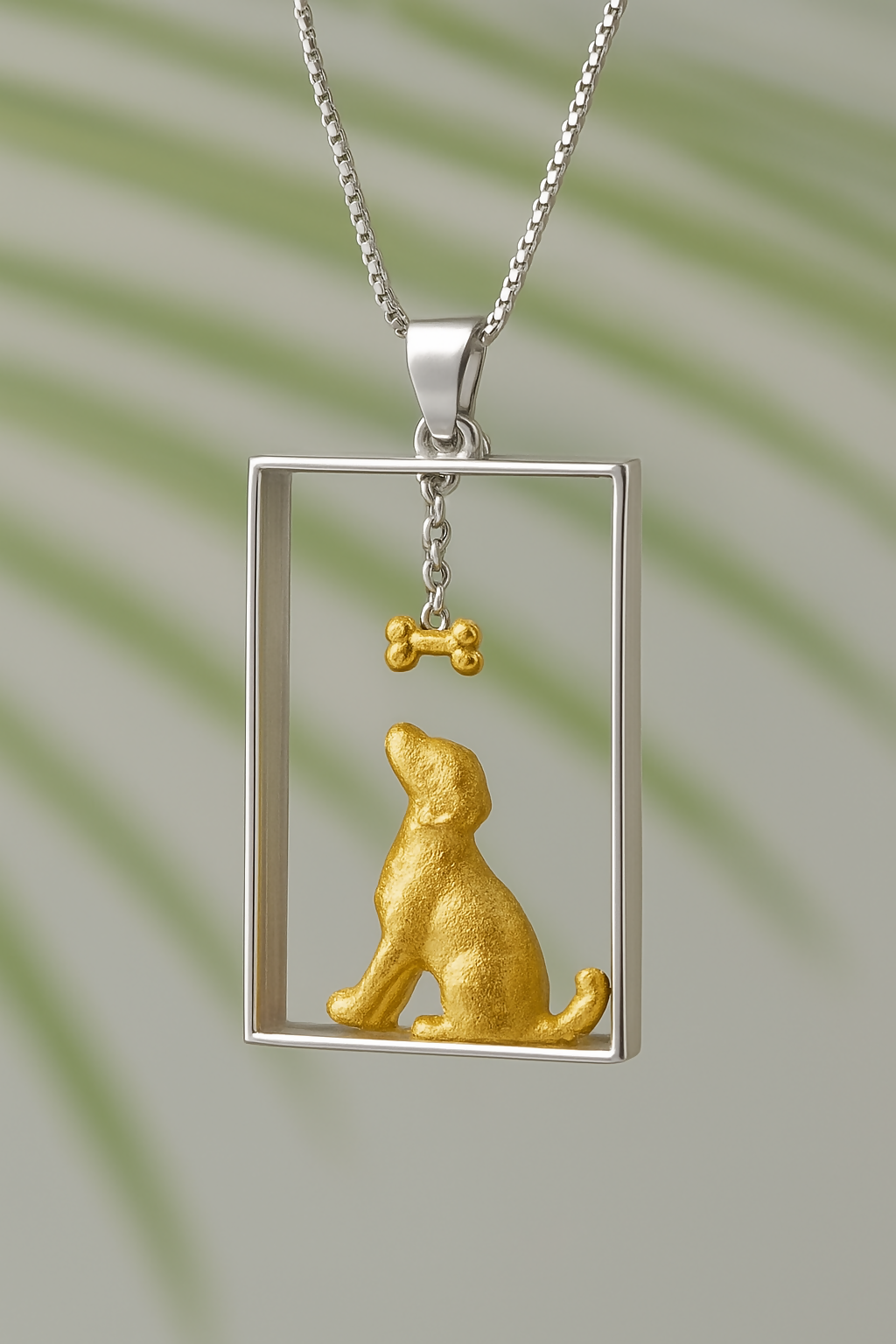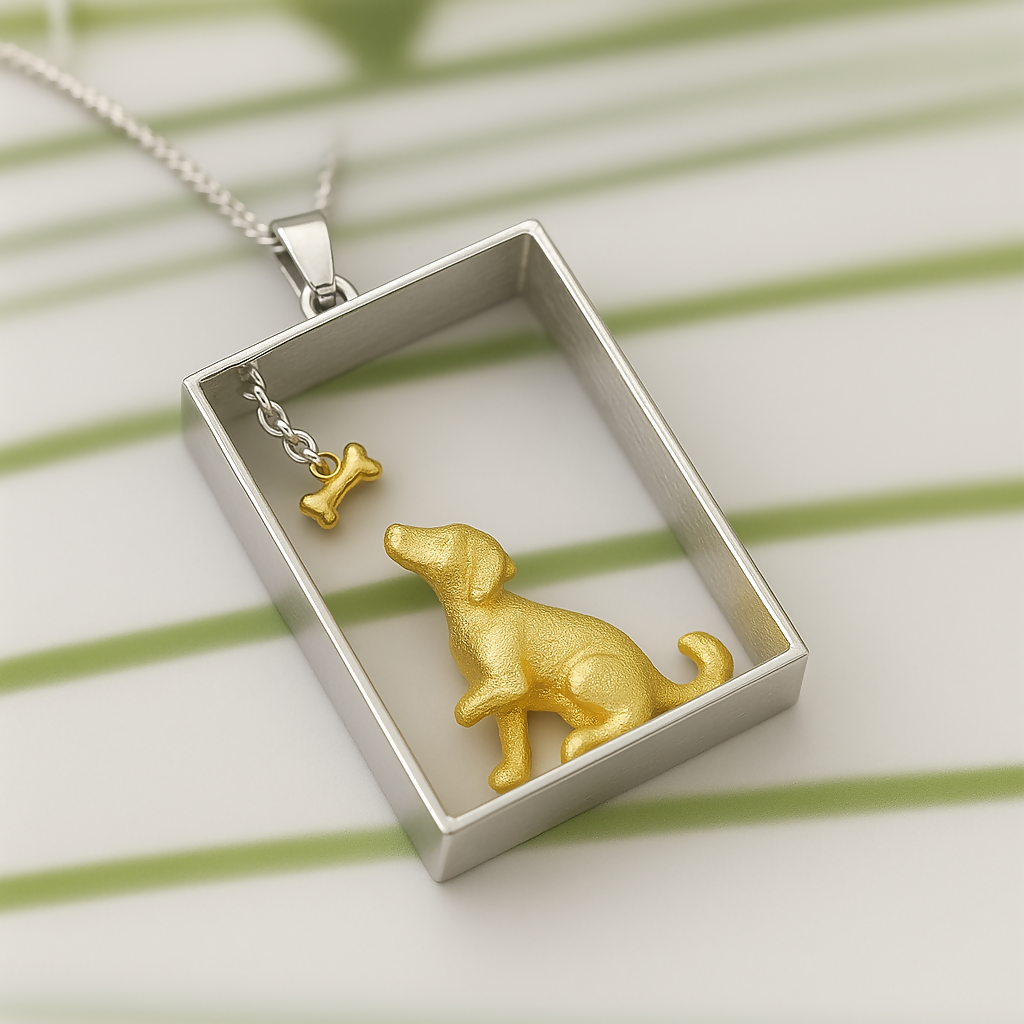 The design features a charming dog figure and a delicate bone charm enclosed within a sleek rectangular frame, symbolizing loyalty, love, and companionship. Each element is thoughtfully detailed to reflect both elegance and sentiment, making it a perfect keepsake for dog lovers or anyone who appreciates meaningful jewelry.
