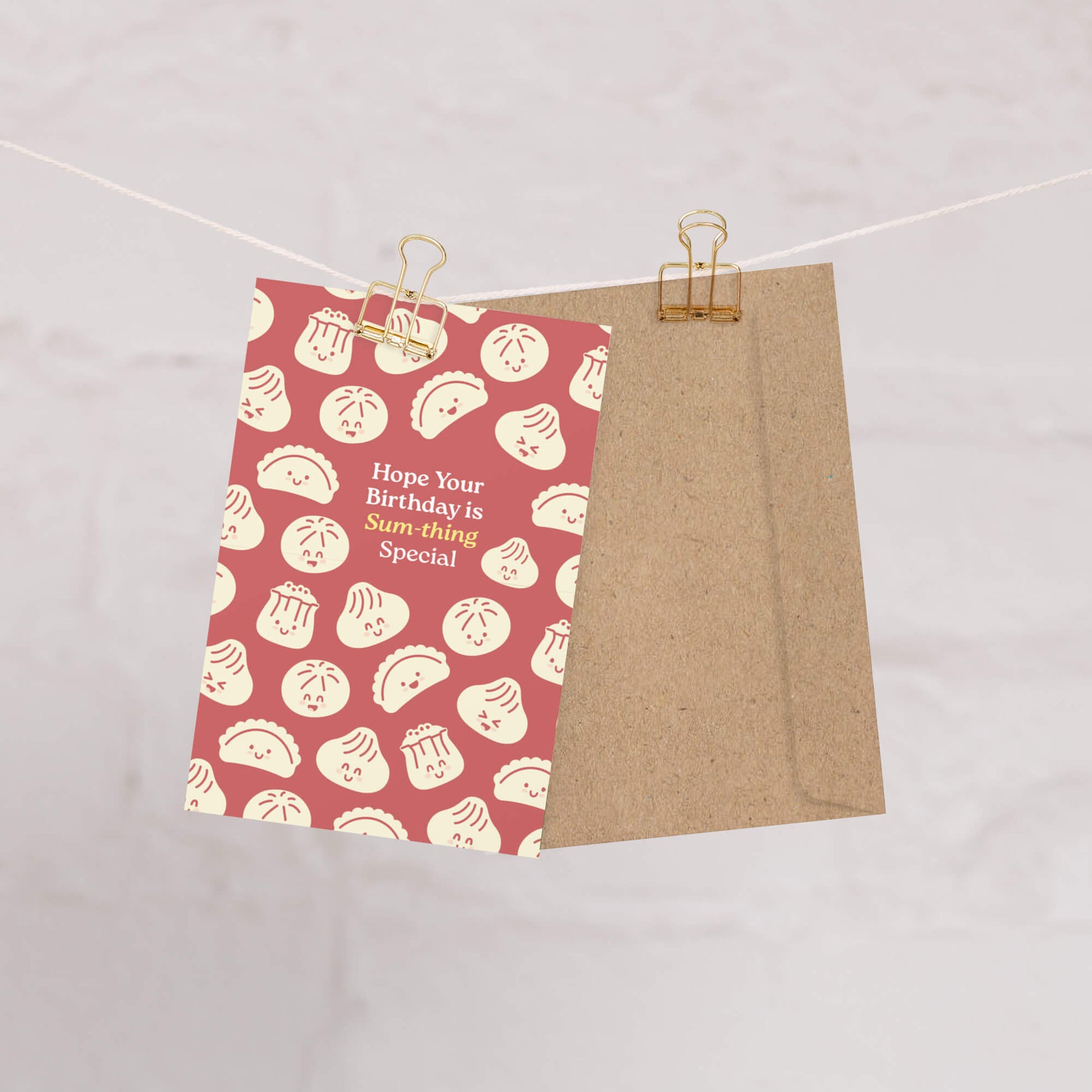 This birthday card is filled with a charming pattern of Chinese dim sum snacks—from siu mai to dumplings—all smiling and ready to party. The pun adds just the right dash of fun. Blank inside with kraft envelope included. Printed in Los Angeles.