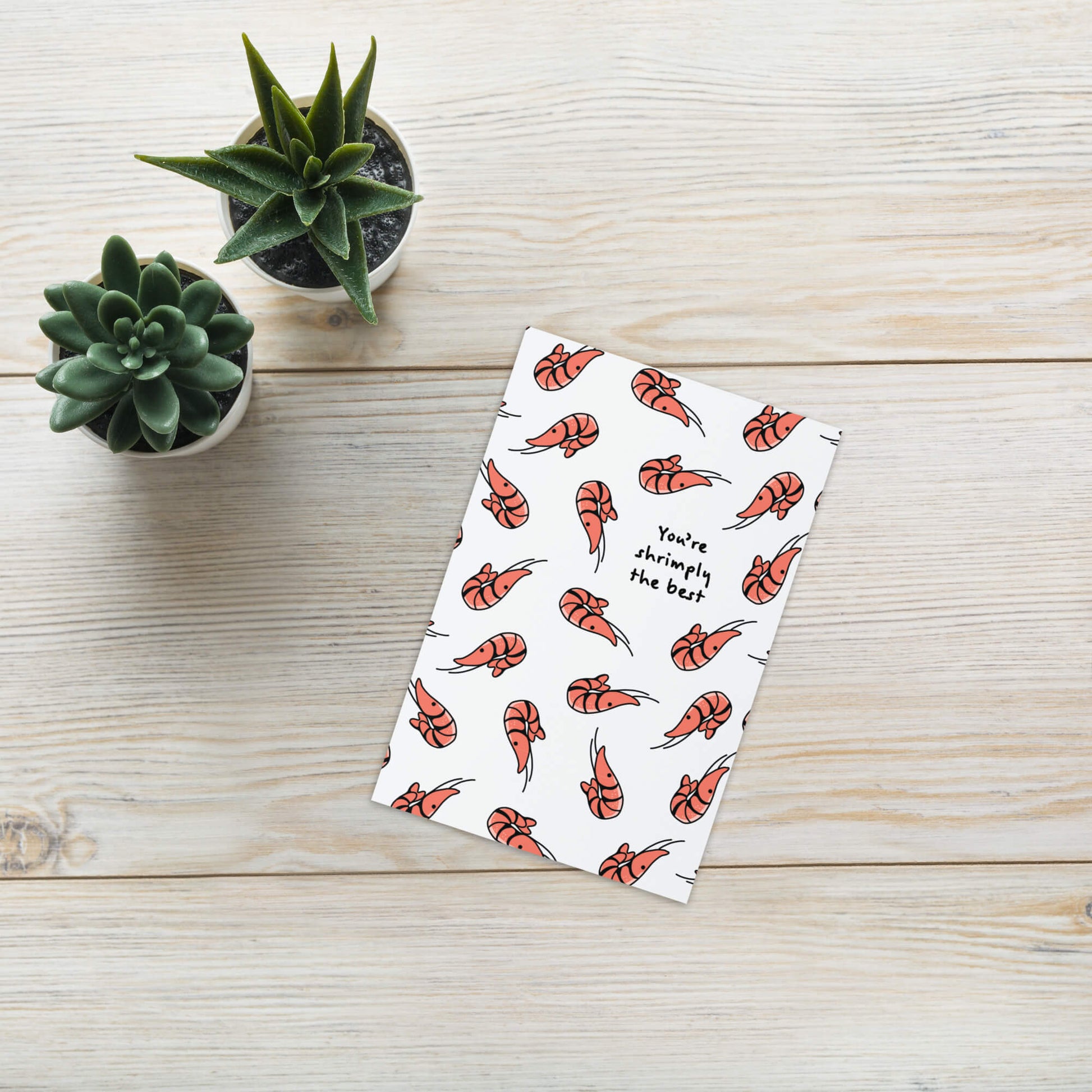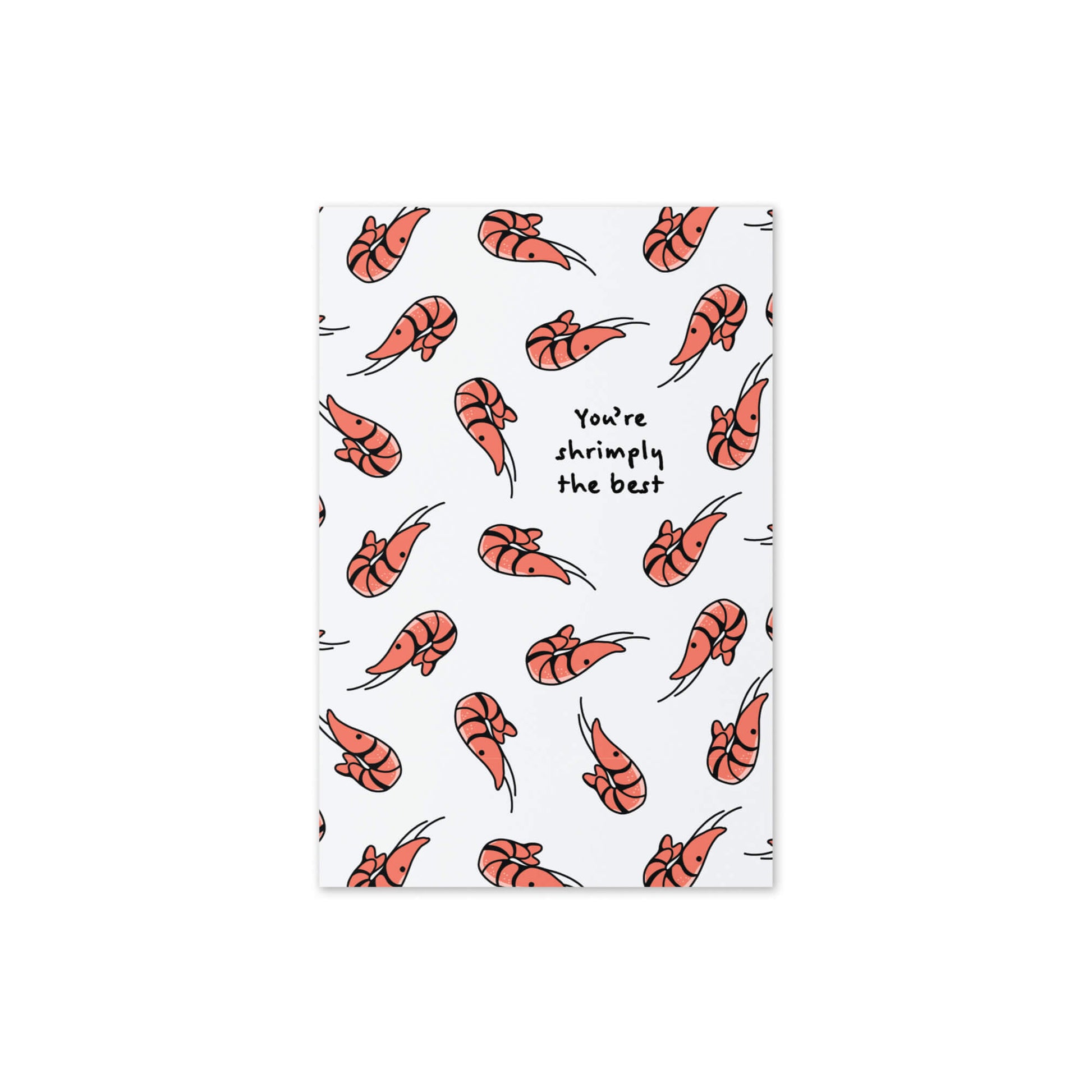A card for the one who’s truly un-shrimp-passable. Featuring a playful pattern of smiling shrimp and bold typography, this card is lighthearted, fun, and full of flavor. Blank inside with kraft envelope included. Printed in Los Angeles.
